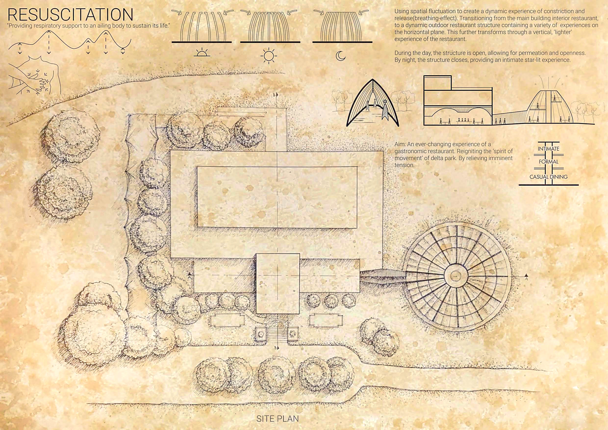 The concept of resuscitation was used to create a rhythmic effect of breathing as one experiences the intervention through its horizontal and vertical axes.